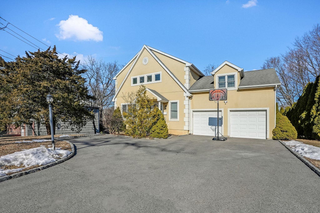 This Colonial sits on a level property with a garage and lots of driveway parking! The entrance hall leads to the formal living room, dining room, a kitchen with island seating and a full pantry closet, an additional dining area, and sliding glass doors to the deck, an adjacent family room with a woodburning fireplace and a powder room. Access to the two car garage through the kitchen. Upstairs is the primary bedroom with a walk-in closet and en suite bath with dual sinks, tub and separate shower. There are three additional bedrooms and a hall bath. The lower level has a rec room, fifth bedroom/home office and a laundry room. Plenty of yard space for play and entertaining. Close to Central School, Hommocks and shopping. Fantastic rental ready now for you to move right in.