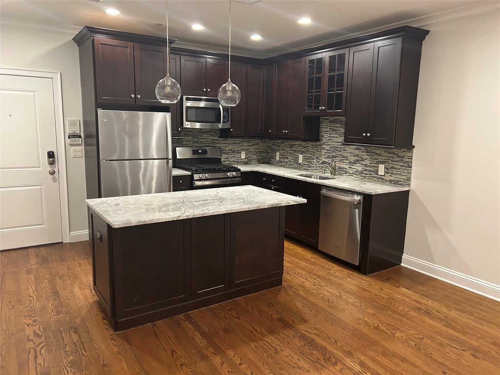 Beautiful 1 bedroom apartment featuring hardwood flooring. Granite counters, stainless appliances, dishwasher, crown molding, central air conditioning. Apartment recently renovated. Close to all. Located right on Main street! Lots of closets!