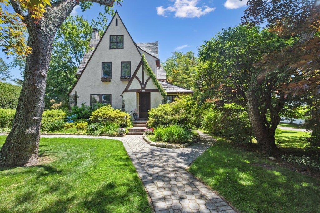 Chockfull of character and charm, this beautifully expanded and updated haven graces an exceptional large, flat property framed by glorious gardens and mature trees. A stunning 2003 extension which includes the kitchen, family room, primary suite and two-car garage, perfectly pairs the magnificent original architectural Tudor details with meaningful modern updates and amenities, making it easy to immediately fall for this beauty. The phenomenal updated floor plan provides lots of versatility with rooms that conveniently open and flow from one to the next; the grand living room expands to the large formal dining room which expands to the spectacular family room which opens to the large eat-in kitchen. For ultimate flexibility, there are also French Doors which can separate the rooms, if preferred. The incredible, sun-filled family room features skylights and two walls of floor to ceiling windows overlooking the spectacular backyard. The spacious kitchen boasts a large dining area, extensive custom wood cabinets, lots of counter space, and a bay window with gorgeous views. The second floor features four impressive bedrooms plus a coveted bedroom-level laundry room. Showcasing panoramic windows, a soaring tray ceiling, recessed lighting, a huge walk-in closet with built-in storage, a second custom closet and a large ensuite bathroom, the primary suite is an oasis. Nestled on the third floor is a private home office with multiple windows. Providing 1,020 sq ft of bonus space, the basement sets up nicely as a playroom, gym or home office. Additional highlights include central air, hardwood floors, wood burning fireplace, many new windows, built-in bookcases, extensive storage space in both the basement and walk-in attic, a long private driveway and a beautiful slate roof. House is heated by oil, yet the stove and hot water tank run on gas. All this in a convenient, charming neighborhood near transportation, worship, shopping, parks and schools.