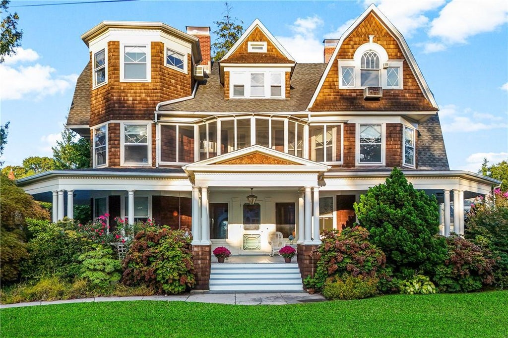 Come live the Larchmont dream in the quintessential Manor Victorian! This picturesque c.1898 cedar-shingle Queen Anne-Style house, prominently situated at the corner of Beach and Woodbine Avenues, is just a short walk to Manor Park and Long Island Sound, as well as to shops and restaurants. With high ceilings and many spacious rooms, the interior offers flexibility as well as rich architectural detail. The exterior offers a huge wraparound porch, a back deck, and a second-floor screened porch. Designed by British architect George Palliser, whose firm was one of the most influential of the 19th century, this house retains an impressive number of original features, both inside and out. All the rooms on the first and second floor boast an array of fine parquet flooring, each with a different border. The gracious entrance hall includes a fireplace, beamed ceiling, and a grand stairwell. Entertain in style in the adjacent dining room, with its magnificent paneling, beamed ceiling, stained glass window, and brick and terra cotta fireplace with integrated mirror. This room is truly a show-stopper! The inviting living room and den are linked by a pointed "Moorish" arch, offering flexible space and two beautiful period fireplaces. Tucked under the stairs is a jewel box of powder room, and just beyond it is a sunroom with decoratively painted lattice walls and an Arts & Crafts period tile floor, all enclosed within beautiful lozenge-shaped leaded glass panes. The large, light-filled kitchen has a radiant-heated floor and a bay-windowed eating area with built-in seat overlooking the back deck. On the second floor, four bedrooms and a hall bath are arranged around the open stairwell. The primary bedroom has a gorgeous floral-carved stone fireplace, an ensuite bathroom, a private screened porch, and a generous walk-in closet. The bedroom/library features a grand fireplace, two walls of built-in bookshelves, and a stained glass window. There are two additional bedrooms, including one located in the house's turret. The hall bath is clad in original tile on both the walls and ceiling. The third floor is a delightful surprise, with high ceilings and spacious, sunny rooms. These are airy, flexible spaces that can be used in a myriad of ways. Bring your imagination! Seventy-one Beach Avenue is waiting to be your new home!