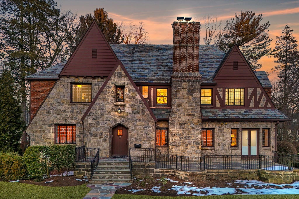 Experience classic Tudor grandeur in this exquisite, stately residence on a picturesque half-acre filled with mature landscaping and a pool in New Rochelle's coveted Bonnie Crest neighborhood. Discover tall ceilings, hardwood and tile floors, and large casement windows throughout. The elegant center hall entry is flanked by a fireplace living room with an adjacent family room and a formal dining room that flows to an oversized eat-in kitchen. A mudroom entry opens to a bedroom suite with laundry that's perfect for staff, while a second bedroom and powder room complete the level. On the upper floor, four huge bedrooms and two windowed baths include a sprawling owner's retreat filled with closets, a home office and dressing room. The lower level adds a rec room, powder room, storage rooms and a garage. The huge backyard tempts you outside with a deck, pool, lawn and towering trees, plus a separate terrace in front. Ideal Wykagyl/Bonnie Crest close to parks, Metro-North stations and parkways.