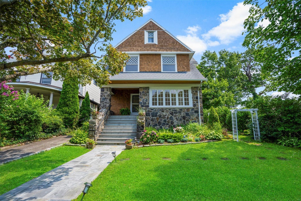 Elegance and charm awaits you at this side hall Colonial in New Rochelle's Historic District. The welcoming stone porch beckons you to enter this captivating 3918 sq. ft. 4 bedroom, 2 bathroom (plus 2 powder rooms) home located on 0.23 of a lush acre with gracious plantings and a lovely arbor. The entrance foyer/receiving room leads to the huge living room (358 sq. ft.) with a pellet fireplace, a beautiful dining room with oversized leaded glass windows, wood beamed ceiling and wood burning fireplace, a powder room, and you will love the 800 sq. ft. Great Room with its custom crafted cathedral wood-beamed ceiling, a Bose speaker system w/built-in speakers, gas fireplace, beautiful hearth, granite counters, wine refrigerator, comfy window seating, beautiful custom crafted cabinetry (did I mention the specialized warming drawer adjacent to the dining room), cabinets galore, office area and easy access to the stone terrace, garden and garage. The winding staircase takes you up to four bedrooms on the second floor (there is a back staircase also), a Jack & Jill powder room. a hall bath, and the third floor has great space with 3 rooms and hall bathroom. The floors have been refinished and gleam, the house has been freshly painted on the first and second floors. There are community red clay tennis courts & just a 30 minute commute to NYC. Close to fine dining and our wonderful art galleries too. Low taxes. Welcome home!