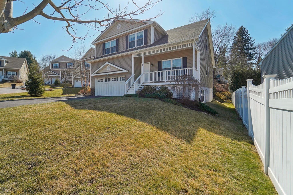 Discover your dream home in this meticulously crafted 2020 Colonial featuring the sought-after Hawk model in Hawkes Crossing. Nestled in a charming cul-de-sac, this exceptional property offers the perfect blend of modern comfort and classic elegance. Boasting four spacious bedrooms and two and a half bathrooms, the home provides ample living space for family and guests. The interior showcases remarkable craftsmanship with beautiful hardwood floors, a stunning 9-foot coffered ceiling, and custom moldings that add sophistication to every room. An open floor plan creates a seamless living experience, enhanced by granite countertops and central air conditioning that ensure style and comfort. The kitchen and living areas flow effortlessly, making entertaining a true pleasure. Outside, a large covered deck and stone patio extend your living space, perfect for outdoor gatherings and relaxation. The attached two-car garage provides convenient parking and storage and features a robust 240v charging station providing seamless accommodation for ease of charging your car at home and the huge unfinished basement, (approx 600sqft included in total), offers tremendous potential for additional living space. Practical amenities include municipal water and sewer, natural gas service, and a freshly painted interior that makes the home move-in ready. Located in a great neighborhood and meticulously maintained, this turnkey home represents an exceptional opportunity to experience low maintenance, stylishly designed, luxury living. Don't miss your chance to make this beautiful Colonial your new home.