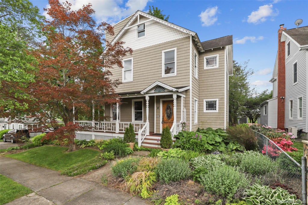 Welcome to this charming vintage front porch Colonial with modern upgrades throughout. Entry hall presents detailed woodworking and stained glass windows. Impressive high ceilings and hardwood floors on the first floor lead into a large living room with crown molding and formal dining room or flexible space. These dual formal rooms are also ideal for a more casual centered lifestyle. Thoughtfully renovated eat in kitchen features stainless steel appliances and skylight. Beautifully updated full bath and main-level laundry enhance both form and function. The second level has 4 bedrooms and a full bath. The upstairs, third level, has an additional 2 bedrooms and offers plenty of room for a home office/library or study, just bring your imagination to the space. This home is set on a level lot with off street parking with town water and sewer, a high efficiency heating system, newer oil tank and central air conditioning. Short distance to Nelson Park, Metro North Railroad and the majestic Hudson River. This house is a gem.