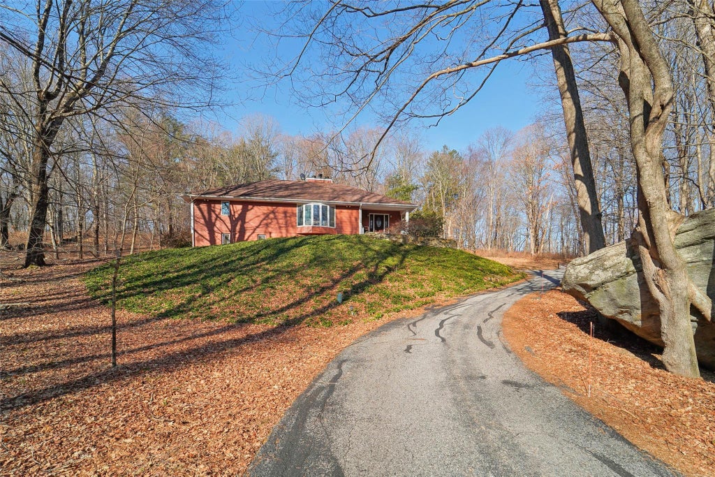 Nestled between rolling horse farms and perched above its own babbling brook, this well-maintained contemporary ranch sits on nearly 5 acres of tree lined private property. Featuring 4 bedrooms and 3 full baths, light pours into this home through expansive windows, skylights, clerestories, and an enormous sunroom. The spacious kitchen opens onto a versatile space featuring a granite clad fireplace and a dining area. The living room with a large bay window features another stone fireplace and bluestone hearth. The bedrooms are all oversized, while the primary bedroom features a spacious bathroom and walk-in cedar closet. The sunroom can be accessed from the dining room and the primary bedroom, and opens onto a large brick patio made for entertaining. The lower level features a 2.5 car garage, a large family room, a wet bar, a bonus room with sliding glass doors, the laundry and utility room. This area may be permitted as an accessory apartment. A fully planked attic with a pull down ladder offers substantial storage space. Other features include two above ground oil tanks for heat and hot water, propane for stove/range, and a back up generator that powers the kitchen, heat, well pump, utility room and lower level family room. A spacious parking area and two storage sheds are located on the property. Offers a great location for commuters, close to I84 and Metro North Railroad. Outdoor enthusiasts will enjoy the close proximity to hiking, skiing and a rail trail for biking.