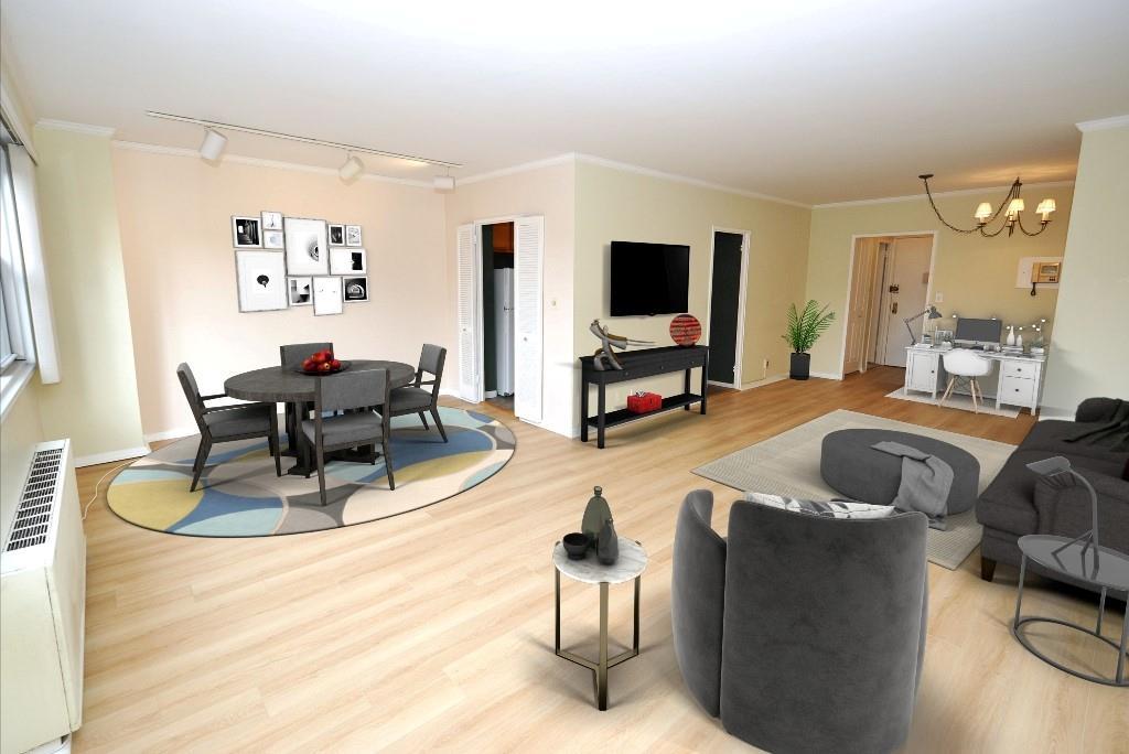 This bright and airy Jr. 4 co-op in the sought-after Garth Essex boasts 1.5 baths, central A/C, and lovely western exposures. Upon entry, you're greeted by closets on both sides, offering ample storage and a coat closet. Just off the foyer, there's a convenient half bath for guests. The foyer can serve as a home office or additional dining area and seamlessly connects to the sunlit open-concept living room and dining/den/home office space, featuring a wall of windows that flood the room with afternoon sunlight. The walkthrough kitchen is equipped with granite countertops, stainless steel appliances, and solid wood cabinets. The spacious 20 x 10 bedroom includes three closets, an en-suite full bath, and enough room for a king-size bed, dresser, end table, and reading chair. Residents of the Garth Essex enjoy laundry facilities on each floor and additional storage options, subject to availability. The location is ideal, with close proximity to downtown Scarsdale, Metro North, Bronx River hiking and biking trails, and the Lake Isle Country Club for golf, tennis, and swimming. Monthly maintenance includes central A/C and is before the basic STAR credit of about $119/month. Estimated monthly maintenance $1,000, Additonal fees $14/month, Dogs are NOT allowed, cats are allowed