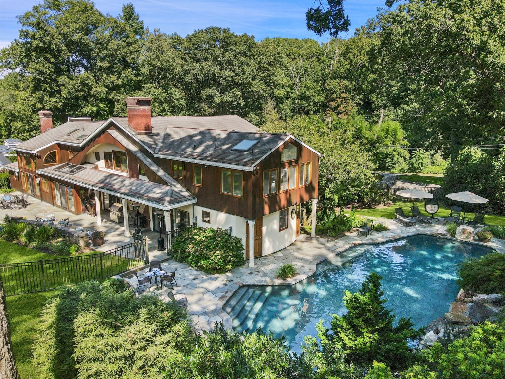 Just a wedge shot away from the prestigious Winged Foot Golf Club, the architectural story of 858 Fenimore Road unfolds. This stunning contemporary home could be ripped out of a page in Arch Di, with old growth redwood on the exterior, high ceilings, skylights and glass windows lining the entire interior. The natural light pours in as you walk through the home. There are 5 bedrooms, 5 full bathrooms and 2 half bathrooms, and a gym, spanning an impressive 5,084 square feet of living space just on the first and second floors. The home is situated on a rare, picturesque - century-old oak trees and stunning rock outcroppings - private acre of land with a pool and outdoor fireplace to gather around. The residence has been featured in renowned magazines, offering a glimpse into its sophisticated allure. The interiors blend seamlessly with the serene, bucolic surroundings, creating the perfect atmosphere for both entertaining and daily living.