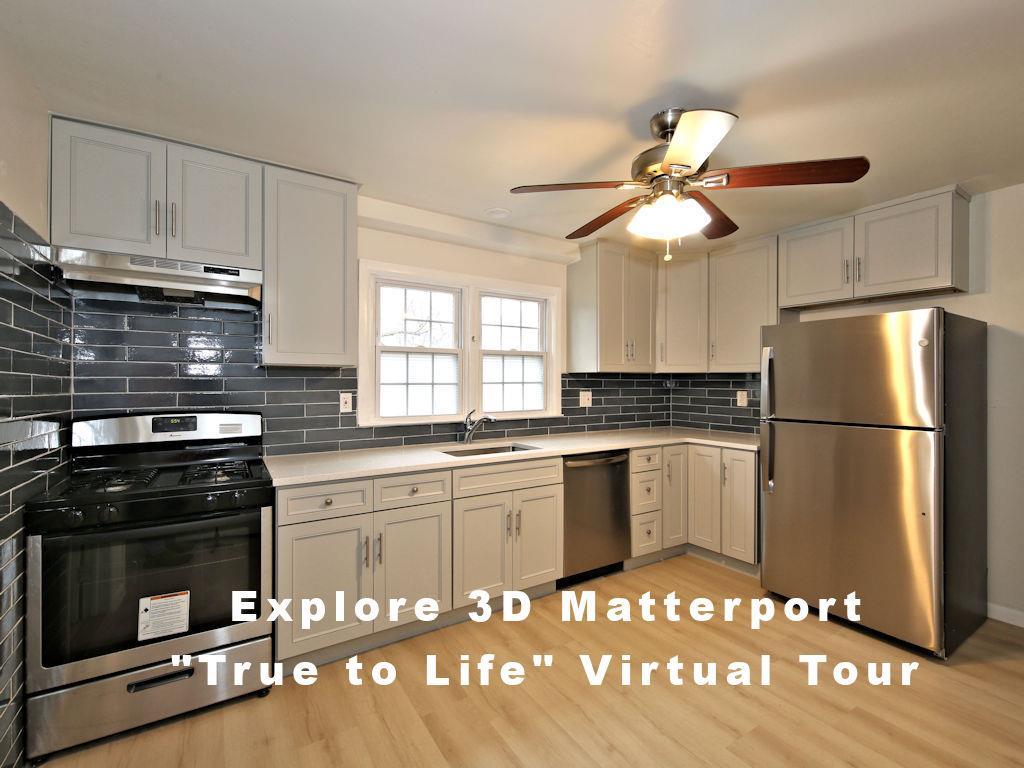 This recently 2025 renovated 3-bedroom apartment in Rye Brook features a thoughtful layout with an open-concept design, maximizing functionality and natural light. The modern kitchen is a highlight, boasting white cabinetry, stainless steel appliances, and a striking blue subway tile backsplash. A ceiling fan adds both style and comfort. The spacious living room and bedrooms are adorned with light-colored wood-look flooring, creating a warm and inviting atmosphere. Large windows in each room flood the space with natural light, while baseboard heating ensures year-round comfort. The primary bedroom, provides ample space for relaxation. The bathroom has been tastefully updated with marble-look tiling, a modern vanity, and a shower/tub combination. A separate laundry room with a top-loading washer adds convenience to daily life. The unit's single-floor layout and neutral color palette throughout offer versatility for various decorating styles. Located at 22 Wyman St in Rye Brook, this apartment combines modern amenities with a practical living space, making it an attractive option for those seeking a contemporary home in a desirable area.