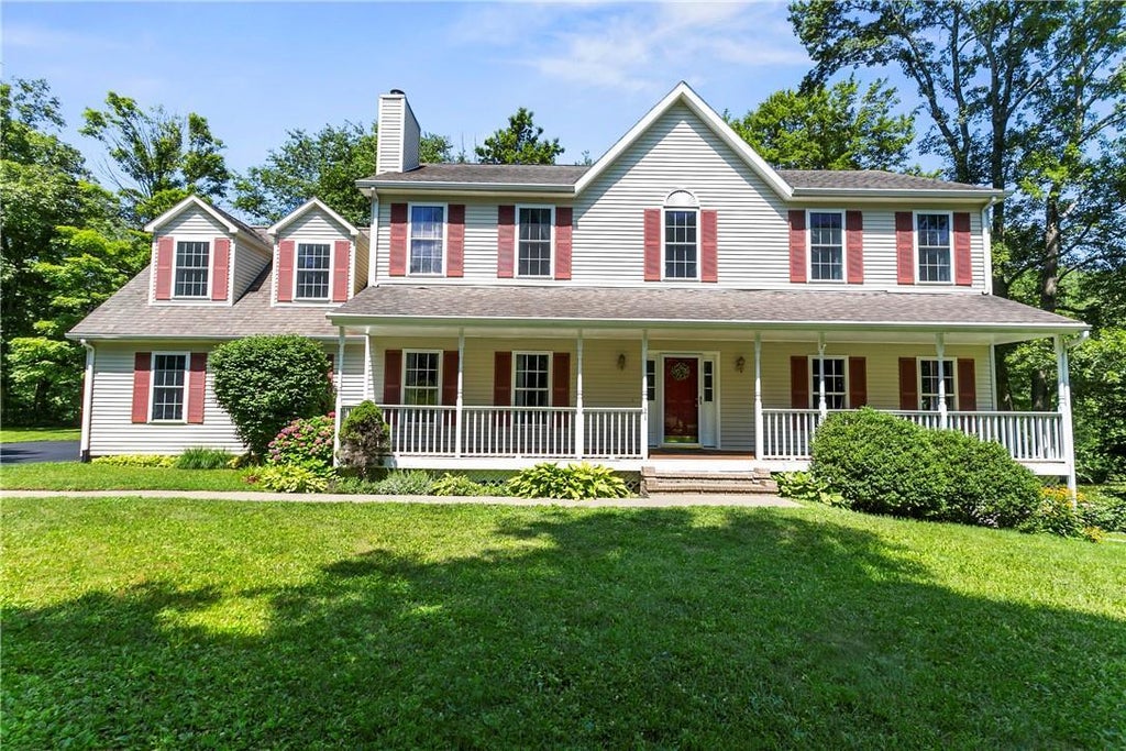 Custom built center hall colonial with water view, nestled privately on a quiet cul-de-sac street. Lovely covered front porch. Beautiful living room boasts a cozy fireplace, perfect for warming up on chilly evenings. Formal dining room offers an ideal space for entertaining. Spacious eat-in kitchen, equipped with ample counter space and cabinetry. Family room provides a comfortable space for casual gatherings. 9 ft ceilings featured on main level, along with lovely crown moldings and wainscotting. Upstairs, you will find a spacious 2-room primary suite, including a walk-in closet and luxurious full bath with granite double sink vanity. The second bedroom also includes a walk-in closet and the third bedroom could be two, with it's unique two-room setup, and its own walk-in closet. The full hall bath with granite double sink vanity serves these bedrooms with style and convenience. The full, unfinished basement presents endless possibilities (and adds almost 1,200 sq feet not included in the square footage shown), with rough plumbing already in place for a future bathroom, plus ample storage, utilities, and a walk-out to the yard. Attached two-car garage. Central air, central vacuum, and transfer switch for a generator. Monitored alarm system. Poured concrete foundation. Sought-after neighborhood. Taxes shown do not reflect the basic STAR deduction, if applicable.