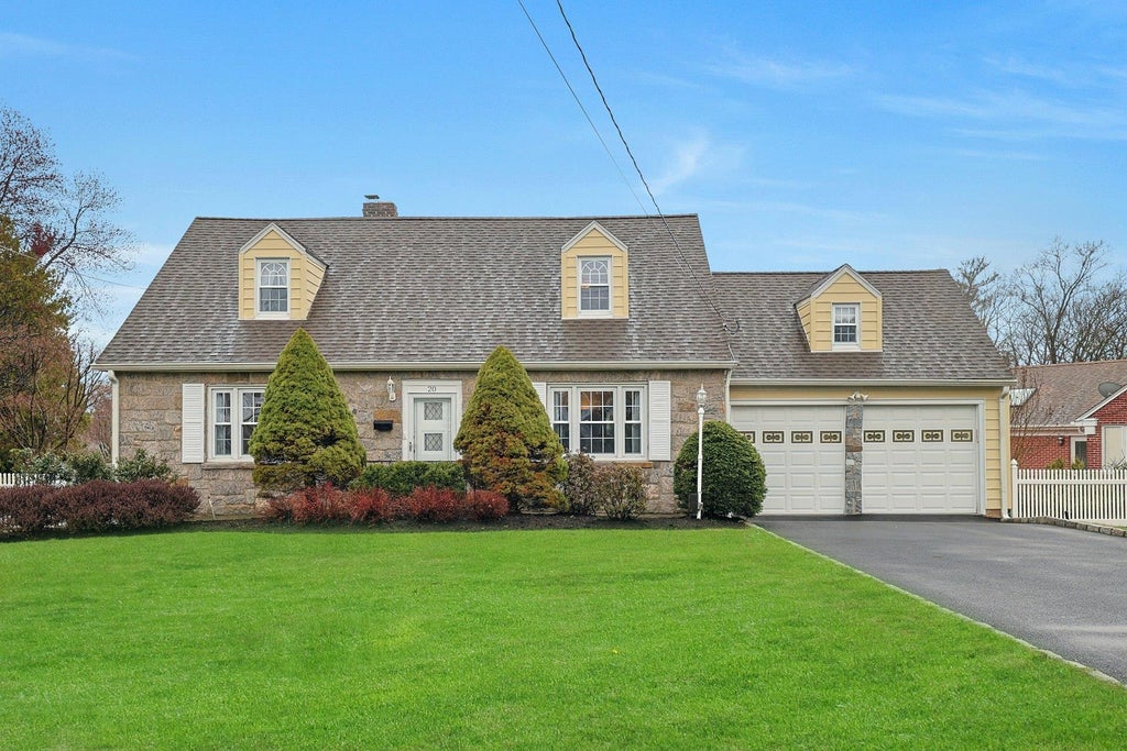 Recent updates include a newly replaced driveway (2023), updated lower-level paneling (2023), a replaced boiler (2014), and a resurfaced deck (2015). Additional features include central air conditioning, a picturesque stone-front facade, and a 2-car garage. Above ground oil tank is under the deck.