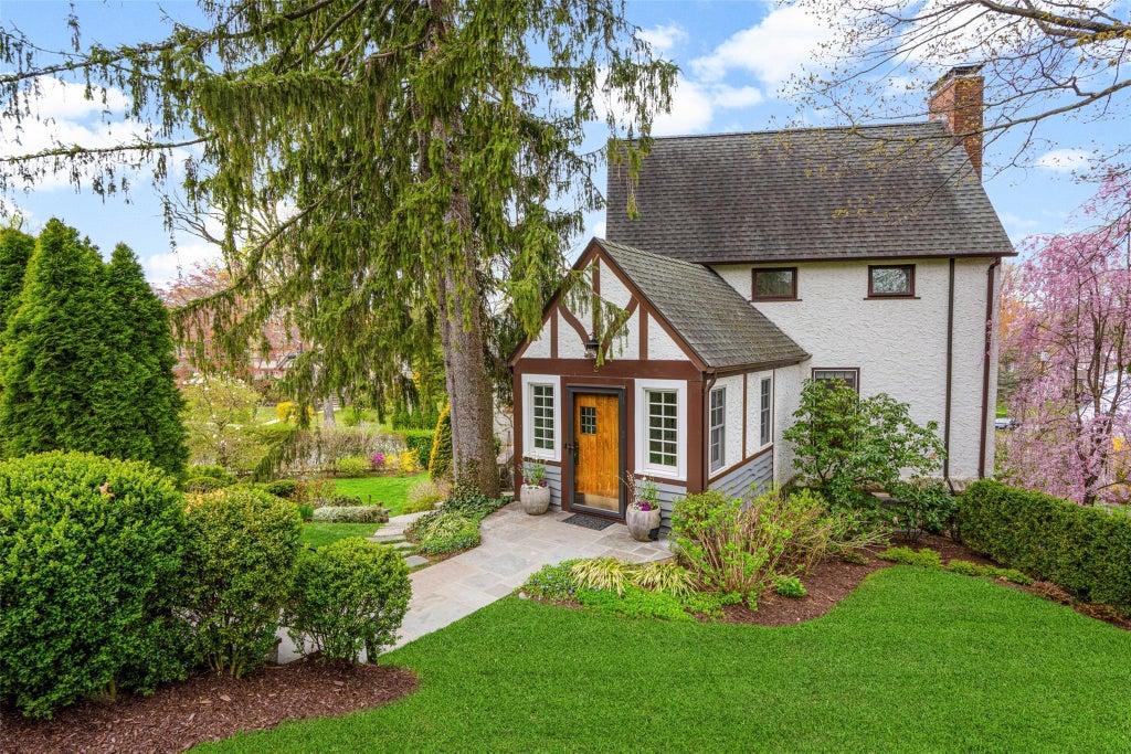 Perched on a sun-soaked corner lot, this storybook 1929 Tudor boasts high ceilings, a feeling of spaciousness, and abundant natural light. This charming home offers rooms that are both grand and welcoming, with a natural flow for entertaining. Step into the welcoming foyer with radiant floor heat, two large coat closets, and a built-in bench with storage that’s perfect for kicking off boots after a stroll. French doors open to reveal a living room with oversized windows on three exposures, a wood-burning fireplace for winter warmth, and architectural details full of character. Two steps down is the dining room, with beamed ceilings and built-in cabinets and buffet areas that make entertaining easy. Pocket doors slide open to a vaulted family room. A large slider looks out on a bluestone patio with beautiful rock-walled perennial beds and a lawn beyond. The light, bright, and delightfully functional kitchen has a powder room tucked nearby. Stairs take you down to a finished bonus space—think home office, playroom, or creative cave. There is a second bluestone patio and a fully fenced rear yard, with plenty of room for a barbeque, a family dining table, and lounge furniture. Upstairs is a primary suite with ensuite bath and dual closets. Two additional bedrooms share a hall bath. There is plenty of storage space with an ample attic plus a bonus storage room off the garage. Located in a friendly neighborhood and within walking distance of the train to New York City, 2 Mulberry Lane is a home that’s easy to love.