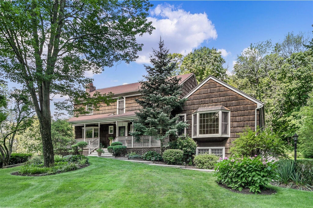 Privacy abounds! Welcome to this front porch four bedroom Colonial on a quiet double cul-de-sac street situated on almost three park like acres with a sprawling front lawn, beautifully landscaped flat property with a pool and pond. The main floor consists of a living room with a wood burning fireplace, dining room, kitchen with a breakfast room, family room, office/bedroom, powder room, full bathroom and a serene sun room. Upstairs is the en-suite primary bedroom, three additional bathrooms and a hall bathroom. An ideal location – close to downtown Armonk and Bedford Village. Make this house yours!