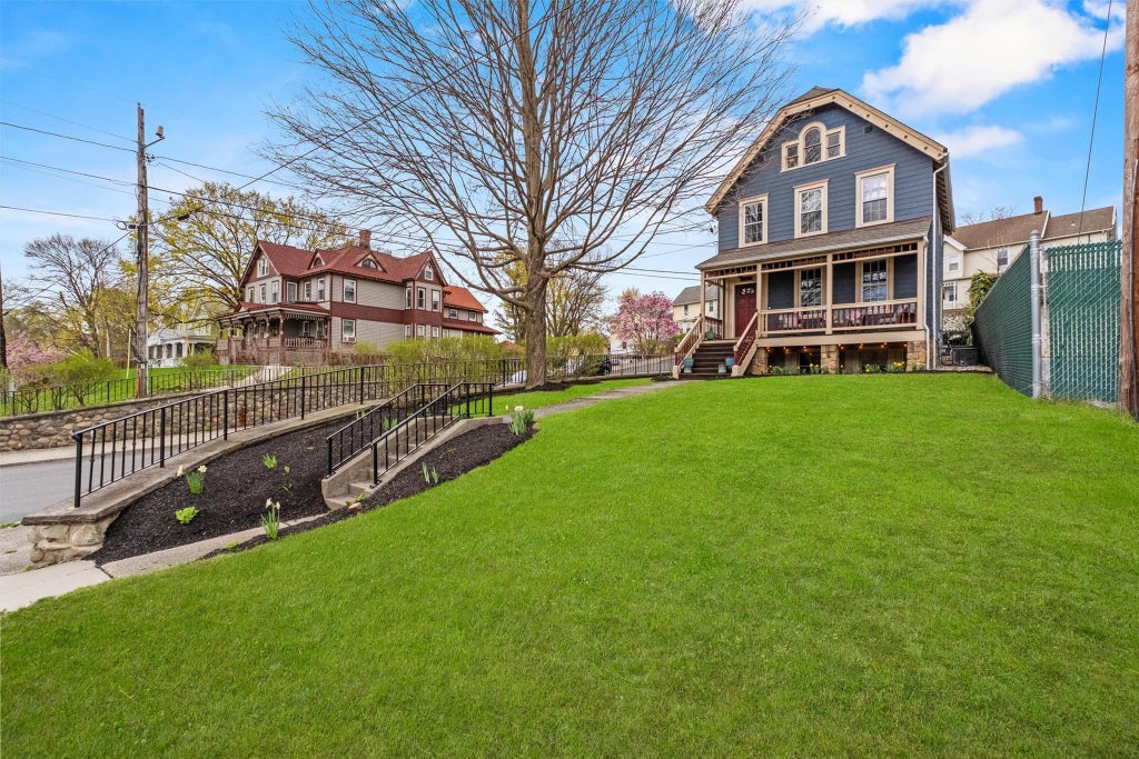 Step onto the rocking chair front porch and into a home full of period crown and base molding, original gleaming wide plank floors throughout, and 9 foot ceilings. The main level features a chef's kitchen with natural gas range, hooded vent, granite and butcher block counters, a stunning island with a breakfast bar, and a back door leading to the private, fully fenced in backyard. And what a yard it is! Full of hydrangea, weeping cherry trees, daffodils, irises, roses, lilacs, tulips, peonies, an ivy privacy fence and so much more. There are transom windows, a beautiful first floor full bath, a formal dining room capturing the original stately ambience of yesteryear with its ornate trim and bay window, and a living room with an ornamental fireplace.