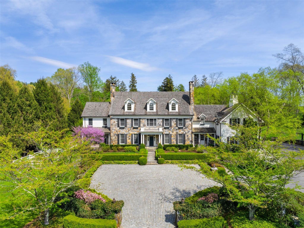 Stately and Refined. Long, gated drive, lined with flowering perennials, to Belgian block courtyard. Absolutely breathtaking eight acres with verdant lawns, spectacular trees and specimen plantings. Striking Stone and Shingle Colonial Estate. Classic floorplan with beautifully scaled-rooms perfect for entertaining. Finely finished and exceptionally appointed living space. Elegant two-story Entrance Hall. Gracely proportioned Living Room with high ceiling and fireplace. Sunroom with wet bar. Steps up to Cherry paneled Library with fireplace. Formal Dining Room with fireplace perfect for holiday dinners. Remarkable Chef’s Kitchen with working island, high end appliances and breakfast area. Spacious, open Family Room with stone fireplace. Luxurious Primary Suite with fireplace, doors to porch and Sitting Room with hall to Two Walk-in Closets and Spa Bath with airjet tub and steam shower. Three additional family Bedrooms. Bedroom/Exercise Suite with private Bath. Third Floor with Studio, Billiard Room, Office and Bath. Lower Level Recreation Room with Spa Bath and finished Storage Room. Heated four-car Garage. Designed for family fun, rear terrace with dining area and built-in barbecue. Arbor-covered seating area in front of outdoor fireplace with raised hearth. Beautiful Swimming Pool with waterfall and spa. Outdoor shower. Incredible grounds with raised bed and fenced gardens and irrigation. Includes separate four-acre lot. Foremost estate area with easy access to train, shopping and commuting arteries. Remarkable!