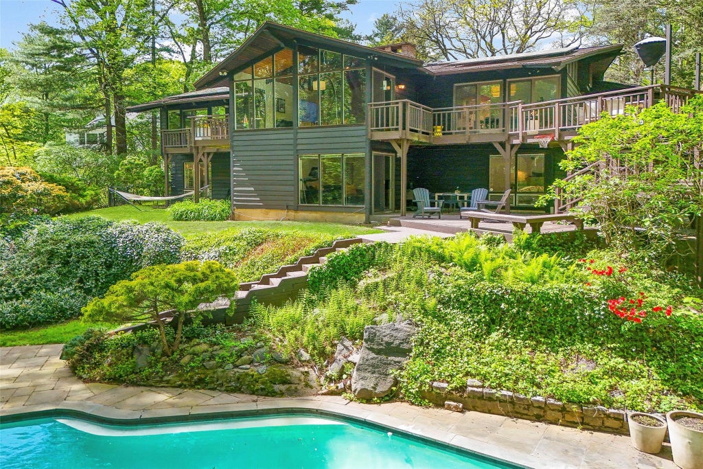 Nestled at the end of a tranquil cul-de-sac, 9 Hidden Green Lane is a turnkey Mid-Century Modern gem that masterfully blends iconic design with modern comforts. Privately sited on a lush 0.78-acre lot and bordering the scenic Leatherstocking Trail, this 5-bedroom, 4.5-bathroom home spans 3,775 square feet and offers the ultimate indoor-outdoor lifestyle. Originally built in 1962, the residence showcases timeless architectural elements including vaulted wood ceilings, skylights, and expansive walls of glass that frame sweeping treetop views. The open floor plan is highlighted by a dramatic living room with fireplace and direct access to wraparound decks, a formal dining area, and a striking eat-in kitchen with custom cabinetry, stainless steel and butcher block countertops, and open shelving. The serene primary suite features a spa-like bathroom, generous closet space, and an adjacent bedroom or office—ideal for remote work or a nursery. The expansive lower level offers radiant heated floors, a spacious family room with fireplace and sliding doors to a lower deck, two en-suite bedrooms, a third additional bedroom, full bath, sauna, and ample storage space. Designed for both relaxation and entertaining, the home’s outdoor amenities include a saltwater in-ground pool, bluestone patio, organic garden, and seamless access to nature. Energy-efficient upgrades, such as owned solar panels, complement modern systems including central air conditioning, EV charging, natural gas heating, and an attached two-car garage. Located in the sought-after Mamaroneck School District and zoned for Murray Avenue School, this architecturally significant home offers a rare opportunity to live in harmony with nature—just minutes from town, train, and all village amenities.