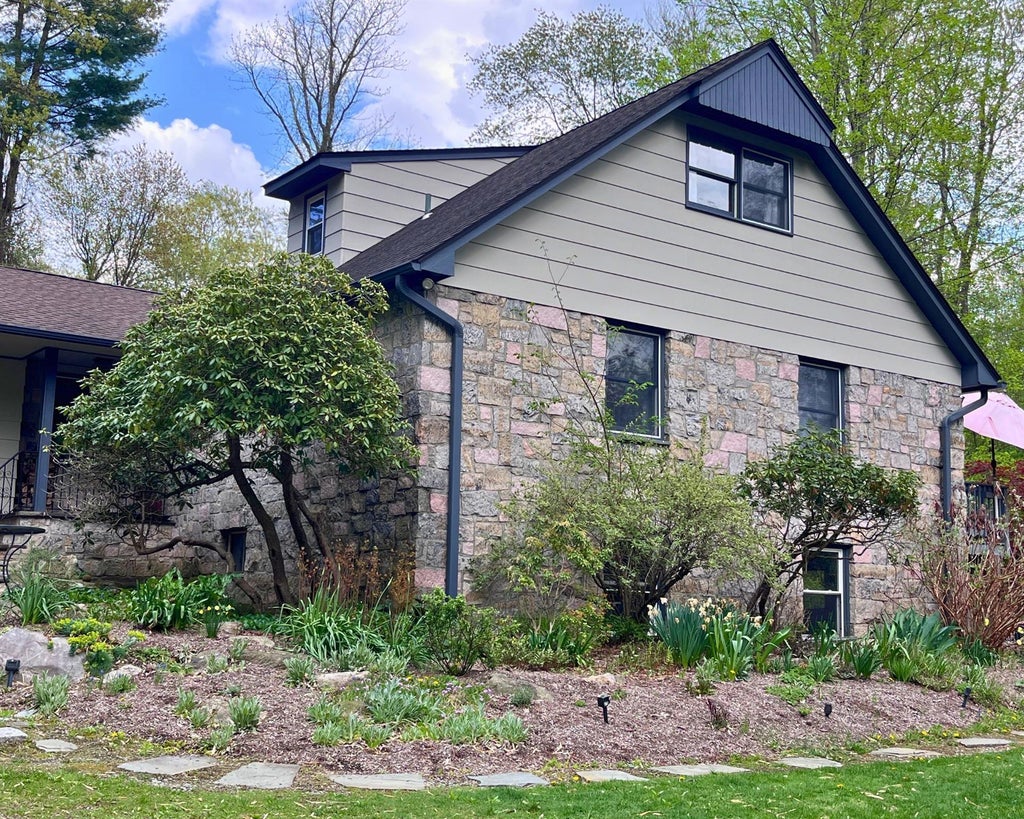 Picture perfect rental surrounded by lush gardens that lives like a private retreat! Enter through the inviting Dutch Door of this charming stone cape into the open floor plan with wood floors, built-ins, and views throughout. Gourmet meal prep and clean-up made a joy using Bosch double ovens, induction cooktop, and dishwasher in the updated kitchen. Enjoy a casual meal seated at the kitchen island, or step out to the secluded patio to enjoy a cup of coffee in the morning and the firepit and stars in the evening. In the winter, retire to the living room's wood burning stone fireplace with a book selected from the many built-ins. Upstairs are two large bedrooms with an updated full bath and abundant closet space. There is an updated half bath on the first floor. Practically everything you could need is included: utilities, laundry, parking, landscaping, even partial furnishings, firewood, and whole home generator. And this is a pet friendly rental--truly a rare find!