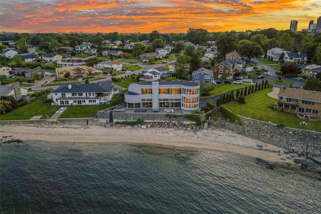 Waterfront Modernist Icon with Private Beach & Endless Views. Offered for the first time by its original owners, this architecturally significant waterfront home boasts over 118 feet of private shoreline and secluded sandy beach, with uninterrupted open ocean views across Long Island Sound. Designed in 1982 by renowned architect Myron Goldfinger and expanded in 1999, the residence is quietly tucked within an exclusive gated enclave of just 12 properties—only 35 minutes from midtown Manhattan by car. Featured in multiple design publications, this almost 6,000 sq ft modernist masterpiece showcases sculptural lines and curves, with soaring ceilings and skylights. Walls of glass blur the boundary between indoors and out, flooding the home with natural light and capturing breathtaking water views from nearly every room of this livable work-of-art home. Enter into the dramatic open living spaces, including a soaring living room with bar area, sunken conversation pit and fireplace, striking dining room, and designer eat-in kitchen. Host unforgettable gatherings year-round with the adjacent glass-clad indoor pool and jacuzzi room, or entertain on a grand scale from the expansive waterfront patio atop a steel beam and reinforced concrete constructed sea-wall. The design blends intimate and expansive public spaces - with sculptural curved stairways leading to four bedrooms thoughtfully spaced across two wings, and connected by a sensational family room on the third floor that feels suspended above the sea. Additional spaces include a home office, two powder rooms, au-pair suite off the kitchen, and two car garage. This one-of-a-kind property is located in an X-500 FEMA zone, so no flood insurance is required. Swim, kayak, or paddleboard from your private beach, forage among the rockpools, or take advantage of the additional association beach area and jetty with mooring rights. A rare chance to own an iconic modernist home with an unparalleled private beach and waterfront views in close proximity to NYC - where architecture, privacy, and nature meet in perfect harmony.