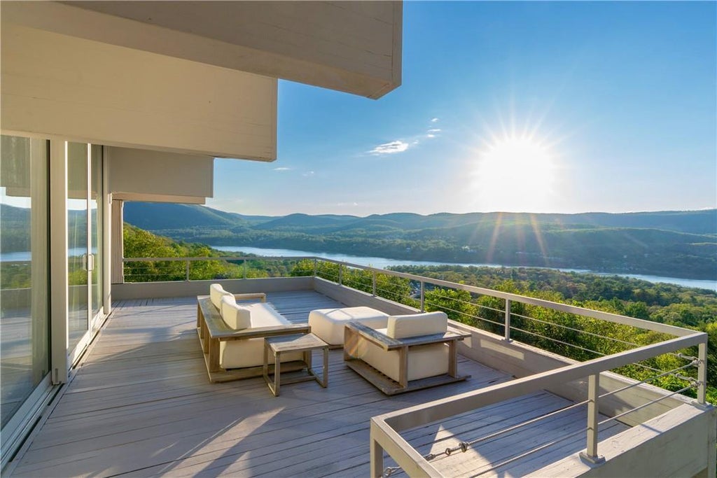 Luxury rooted in simplicity: an outstanding Madderlake-designed contemporary with 180 degree views of the Hudson River. Perched on 6 acres, high on a hill in Garrison, NY, the residence is revealed via a long scenic driveway that opens to magnificent Hudson River views and a landscaped front garden. Bathed in celestial golden light, the recently upgraded floor-to-ceiling, energy-efficient glass walls and doors and new wrap-around deck offer ever-changing sunsets year-round. With its 10 ft white-washed ceilings, mix of rich woods and polished concrete and epic indoor pool wing, this recently gut-renovated monument to minimalism is regularly used for a long list of celebrity and high fashion shoots. The sun-drenched open-plan main floor redefines flexibility, starting with a chef’s kitchen, formerly owned by cookbook author & Vogue food columnist Barbara Kafka. There’s a seamless flow between kitchen, dining room with sliding glass doors to the deck, and great room with wood burning fireplace and modernist marble mantel. A main floor primary suite with spa bath, wrapped in glass with ravishing Hudson River views. A sundrenched second bedroom now being used as an office with double-exposure glass walls completes this floor. There are infinite options for leisure and entertainment on the natural-light-filled first floor. An oversized indoor sandstone pool with a wall of glass overlooks the Hudson and enables owners to live the tropical spa life in every season. An adjacent lounge area is the perfect spot for a post-swim gathering. The great room/media room, gleaming with polished terrazzo-style concrete floors, has a woodburning fireplace with custom maple mantel, a spacious guest suite with spa bath and boutique-hotel caliber sauna. An additional bedroom, stylish full bath and office/artist studio/gym flex space complete this level. Even the location is a luxury: minutes to Metro-North, Bear Mt Bridge to Palisades Parkway and 50-minute drive to Manhattan. No shortage of excellent art options & culinary delights between nearby DIA Beacon and Storm King sculpture park, and the recently restored 18th century ever-beloved Bird & Bottle Inn and restaurant. Additional Information: HeatingFuel:Oil Above Ground