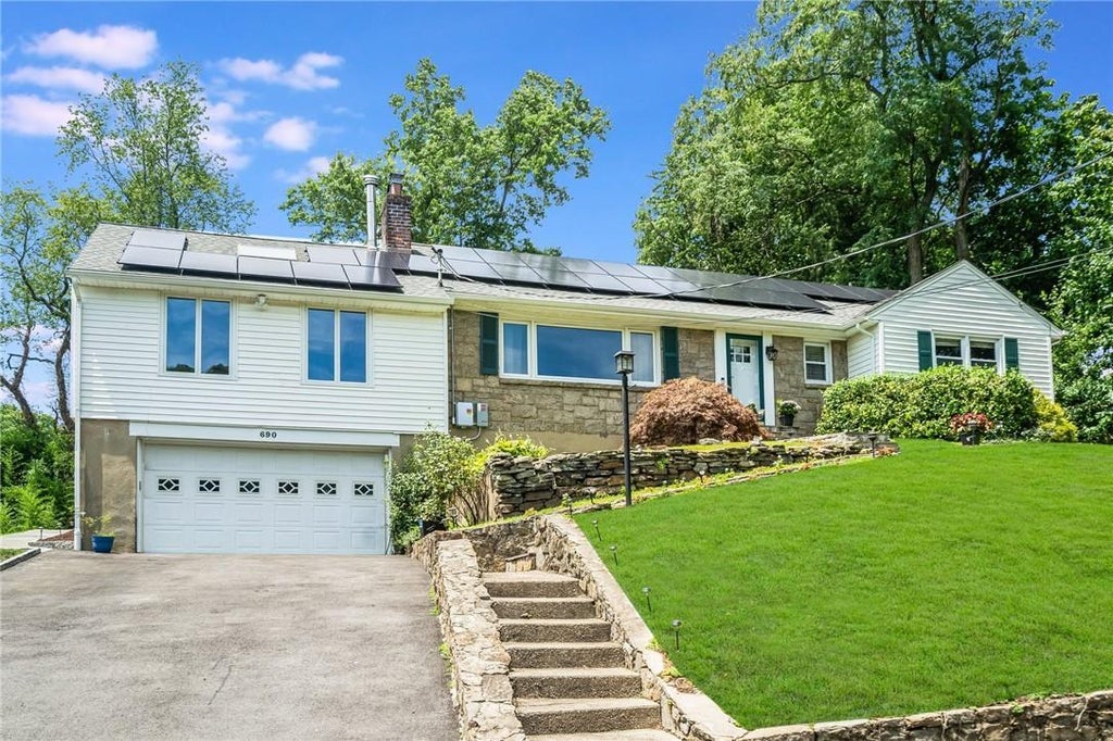 Introducing 690 Pinebrook Boulevard in Pinebrook Heights section of New Rochelle. Exquisitely updated three bedroom Ranch home situated on .37 acres of meticulously landscaped ground. Prepare to be impressed upon entering with many updates as you are greeted by a warm and inviting living room with an abundance of natural light, built-ins, wood burning fireplace, hardwood floors and adjacent dining room with views of beautiful private backyard. The dining room flows into sunken over sized family room overlooking the deck with walls of windows, vaulted beamed ceiling, skylights and wood burning stove. The newly renovated modern kitchen showcases quartz countertops, tiled backsplash and stainless steel appliances. Kitchen opens to sunroom/playroom with glass doors to parklike grounds. Primary bedroom, primary bathroom, two additional bedrooms and a hall bathroom completes this level. Lower floor offers an office, laundry room, utilities and door to garage. Large deck accessible from the family room an ideal spot for your morning coffee or simply enjoying a quiet evening outdoors Stunning private backyard perfect for hosting barbeques. The possibilities are endless with perfect blend of tranquility and convenience. Solar panels are owned. The house is not in Flood zone. Minutes to parkways, shops and restaurants. A wonderful place to call your home! Additional Information: HeatingFuel:Oil Above Ground,ParkingFeatures:1 Car Attached