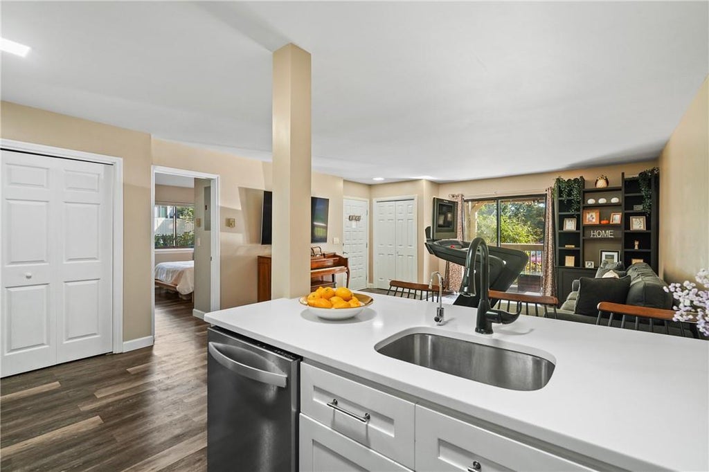 This beautifully renovated middle-income unit, situated on the ground floor with no steps, offers the perfect combination of comfort and convenience. The updated kitchen features sleek stainless steel appliances, white quartz countertops, and a cozy breakfast bar with seating for four, seamlessly flowing into the spacious living room adorned with elegant laminate flooring—an ideal setting for both relaxing and entertaining. The peaceful corner bedroom serves as a tranquil retreat, complete with an en-suite bathroom and generous closet space. The unit also includes the added convenience of in-unit laundry. Located in the desirable Oakridge complex, enjoy access to top-tier amenities, including a main pool, a wading pool with newly installed paver decking, tennis courts, a basketball court, a scenic jogging trail, and a serene lake.
