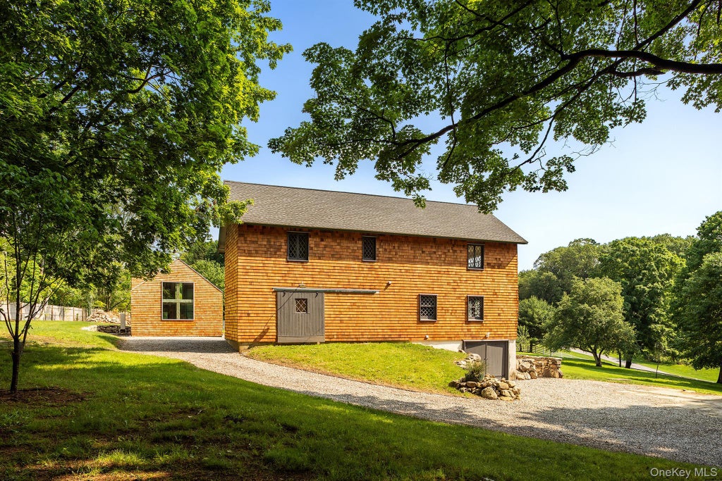 The Barn seamlessly blends rustic charm with contemporary upgrades. It houses a fully renovated two-bedroom accessory apartment, featuring an updated kitchen, recessed lighting, and a modern full bath. Below, an open studio space awaits transformation, boasting floor-to-ceiling windows and a half bath. Enhancements include new plumbing, electrical systems, Bosch HVAC, Fujitsu mini-splits, and a whole-house generator. Plans for the Barn have been filed and permitted by the Town of Bedford, with a custom-fabricated 26-foot-wide wall of storefront glass ready for installation, ensuring panoramic views and abundant natural light.